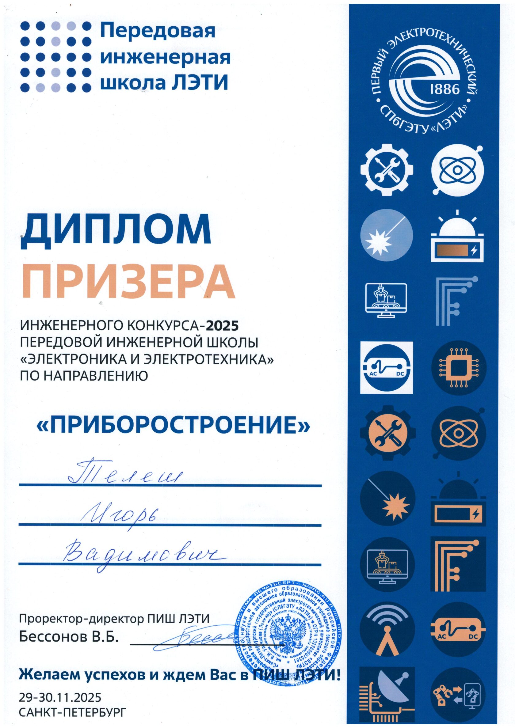 Ученик 10-го технического класса, стал призёром инженерного конкурса «Электроника и электротехника» по направлению «Приборостроение» на базе Передовой инженерной школы ЛЭТИ в 2025 году!